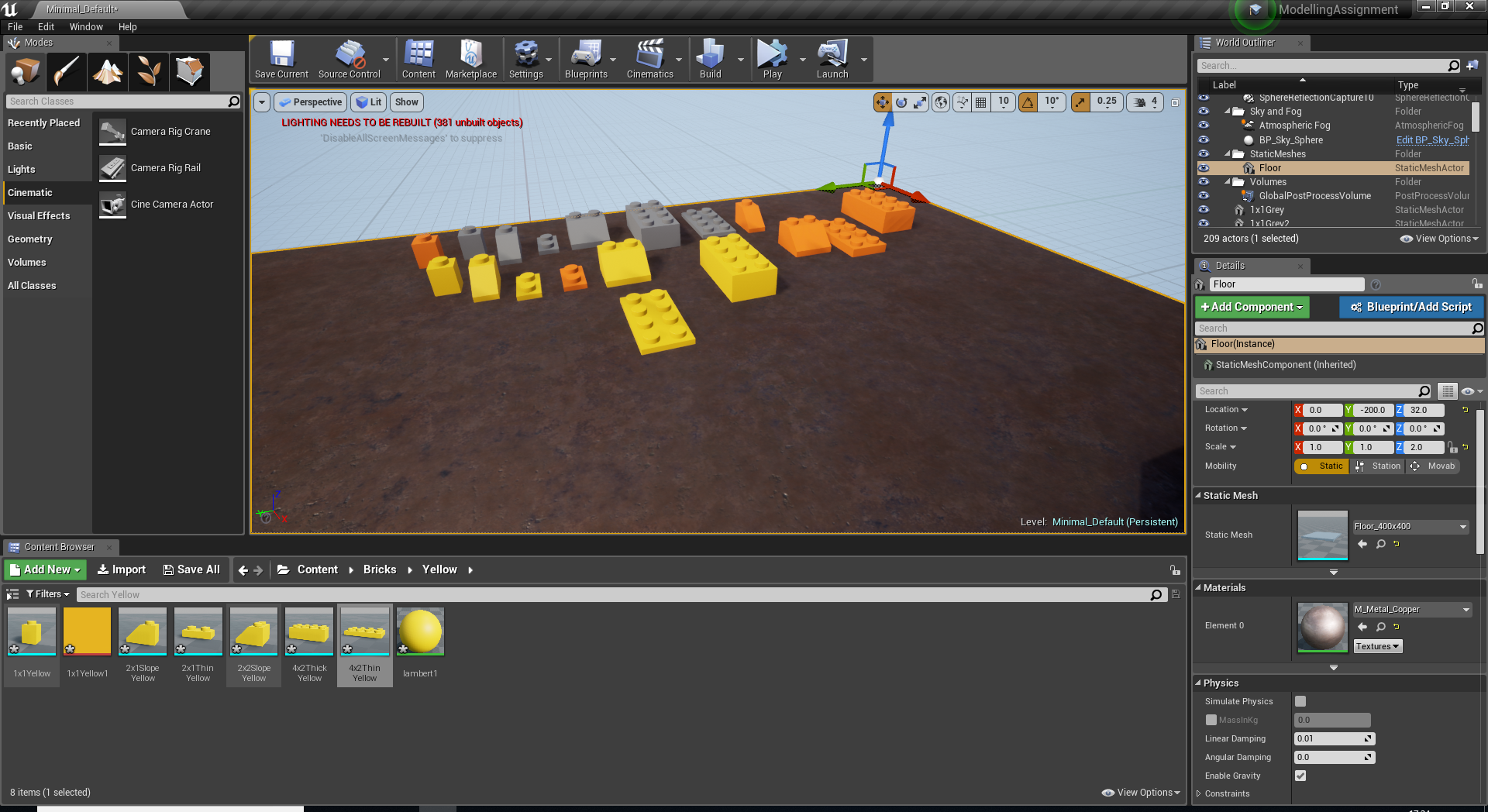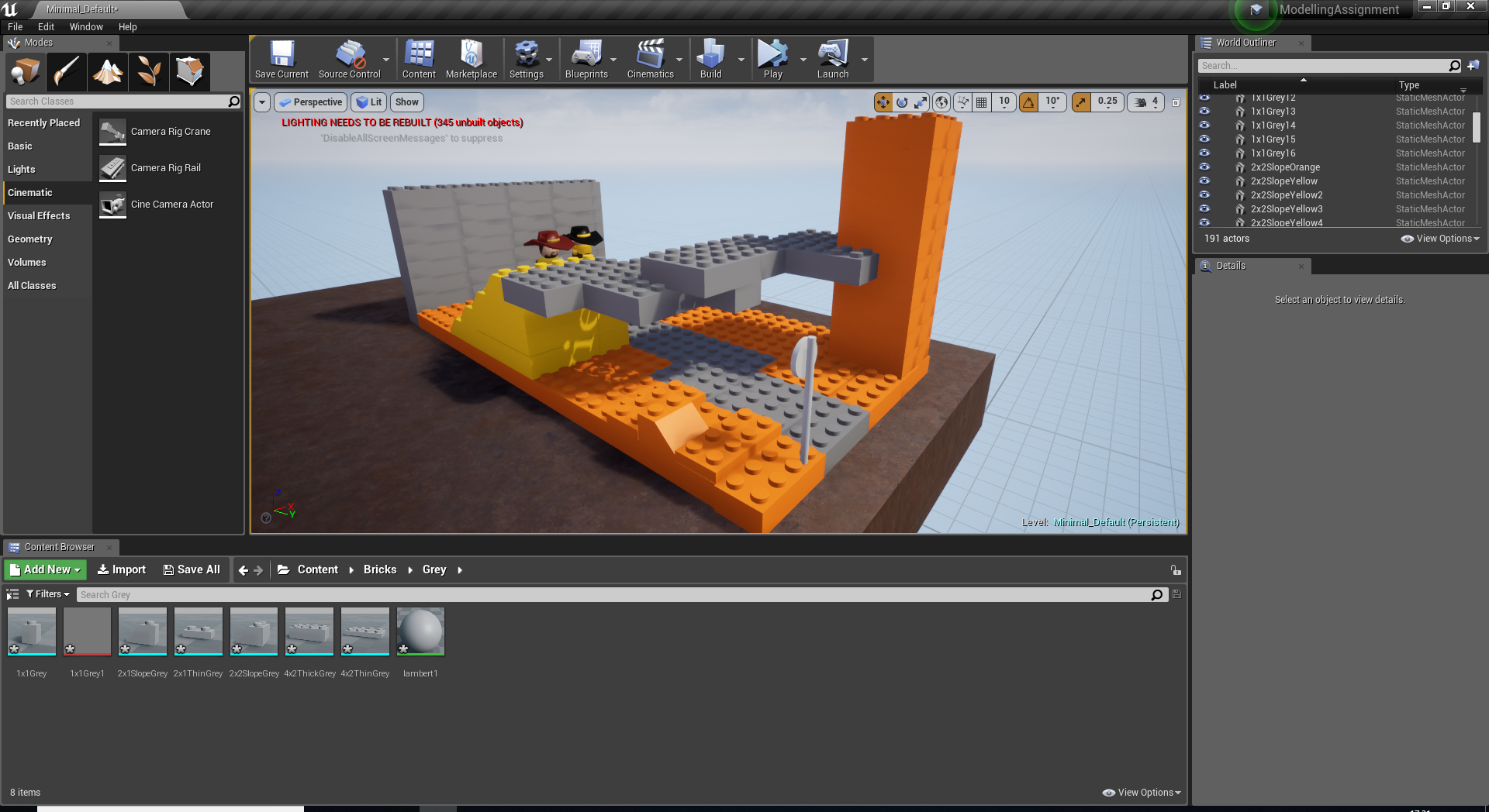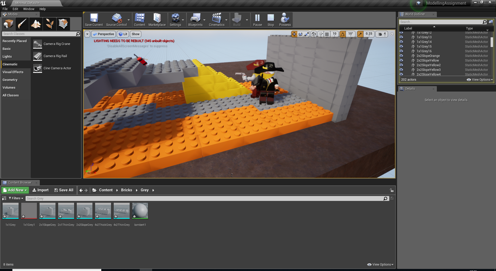 Being completely new to Unreal, I taken a lot of time out to learn how to use it at its very basic level. This helped me figure out what I was doing to start building my scene. Using the LEGO blocks that I created in Maya I created a completely custom scene and placed my characters inside. The main challenge I found with this was figuring out how to use my animations from Maya in Unreal. If I was going to do anything in Unreal again I would take more time out to find out exactly how to use the engine in every way to get the results I want. These are the screenshots that I have from importing my objects and organizing them, placing my bricks into Unreal and capturing the animation at its midpoint and ending.