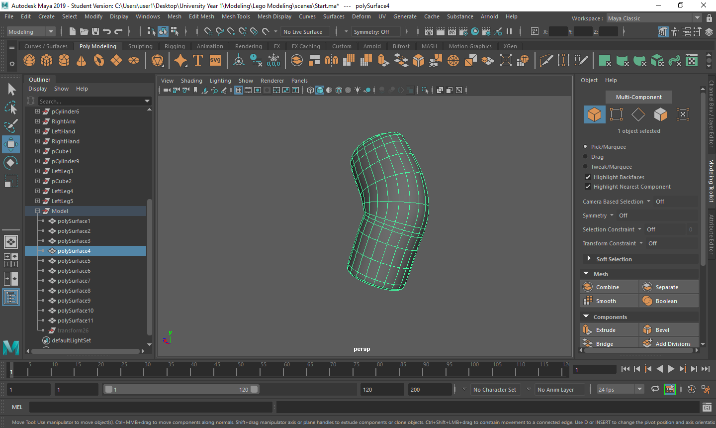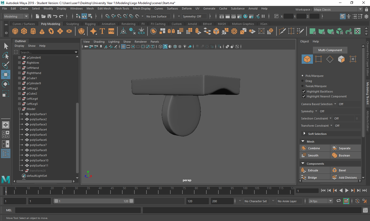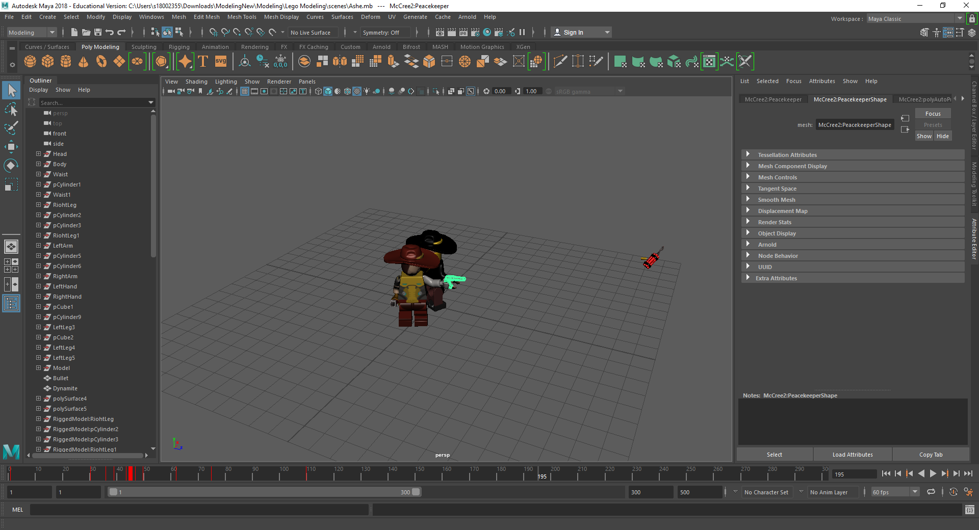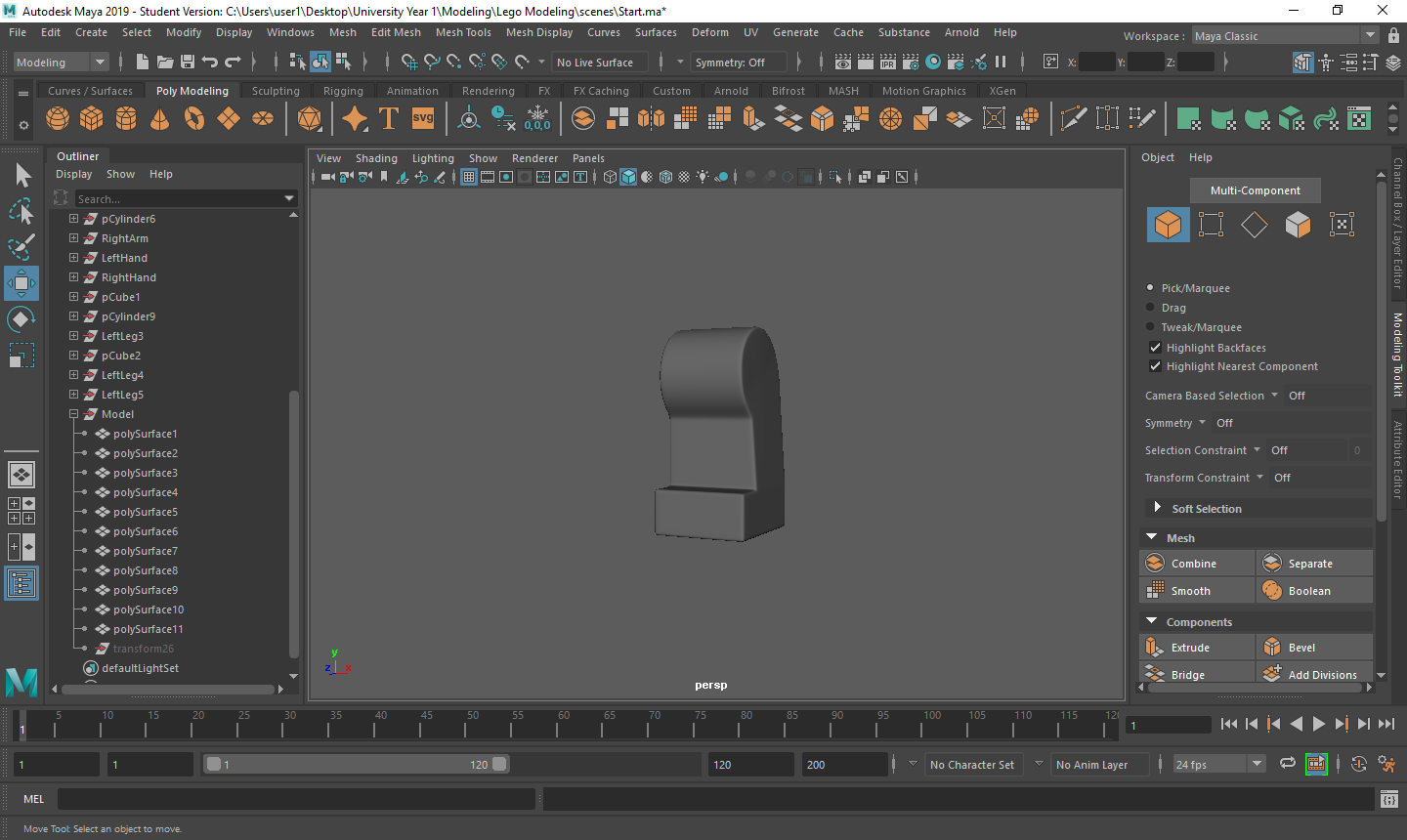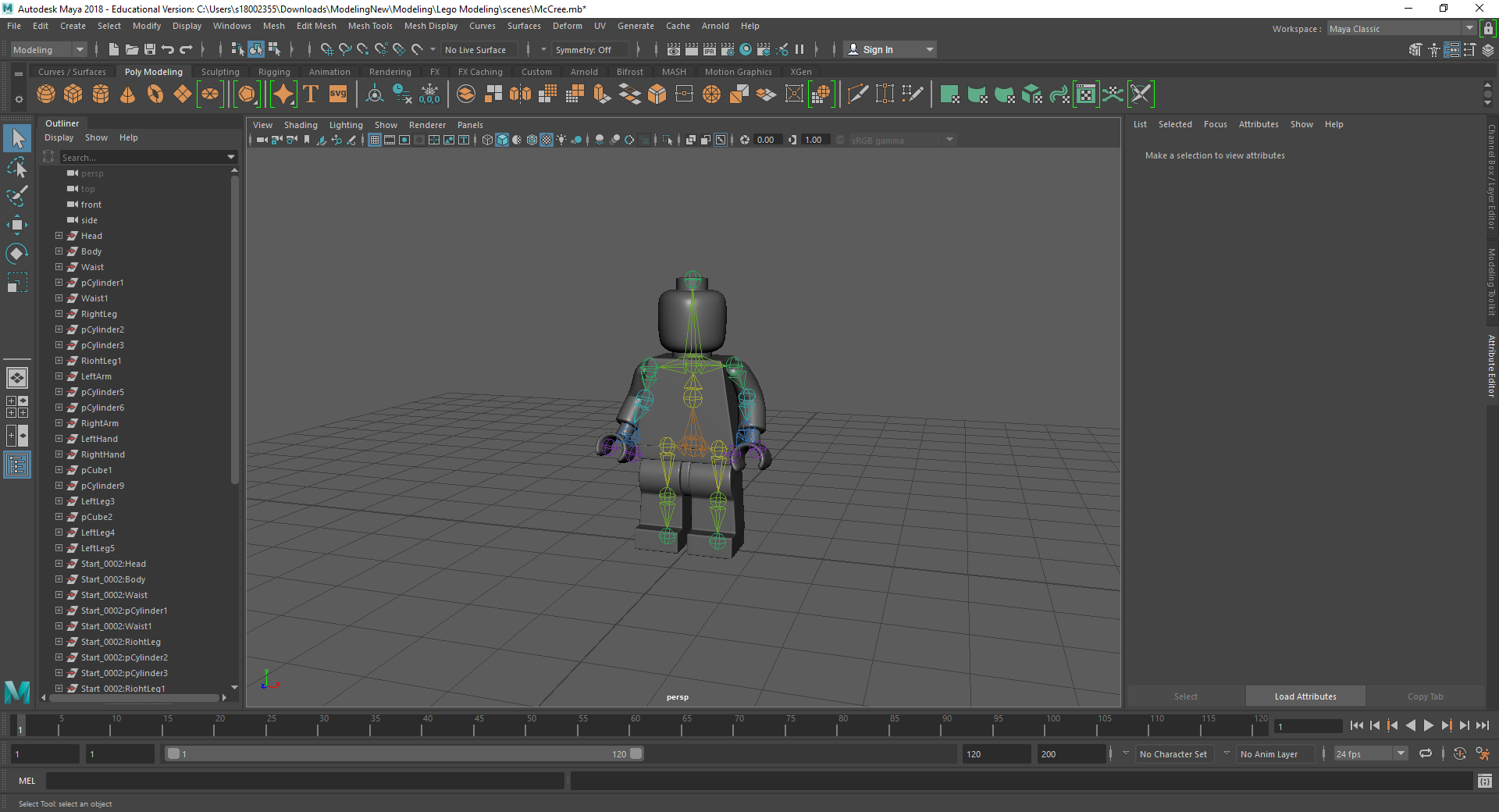 Rigging the LEGO model was a challenge for me. Firstly, with the amount of individual parts I had, making sure that all of the mapping weights were correct took a long time as sometimes there would be one vertex being affected by something it shouldn’t be and that would throw the model out of shape. Secondly, there was many iterations that I went through to make sure that it was perfect for the character I was using. Having parts that had holes in them or were attached to a certain joint also took a couple tries to figure out what I was doing.