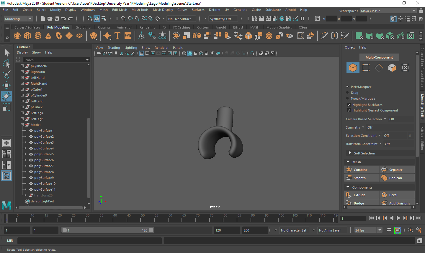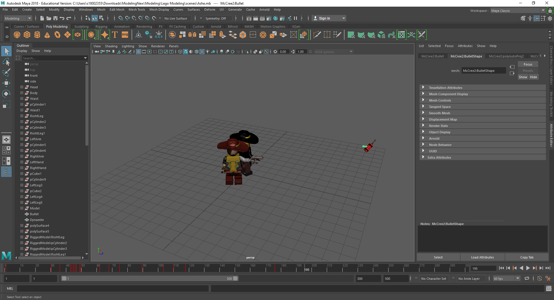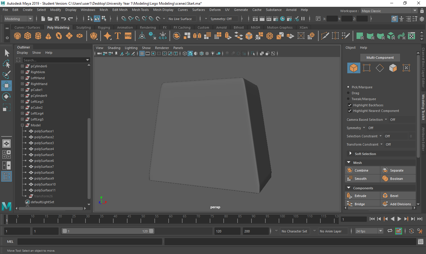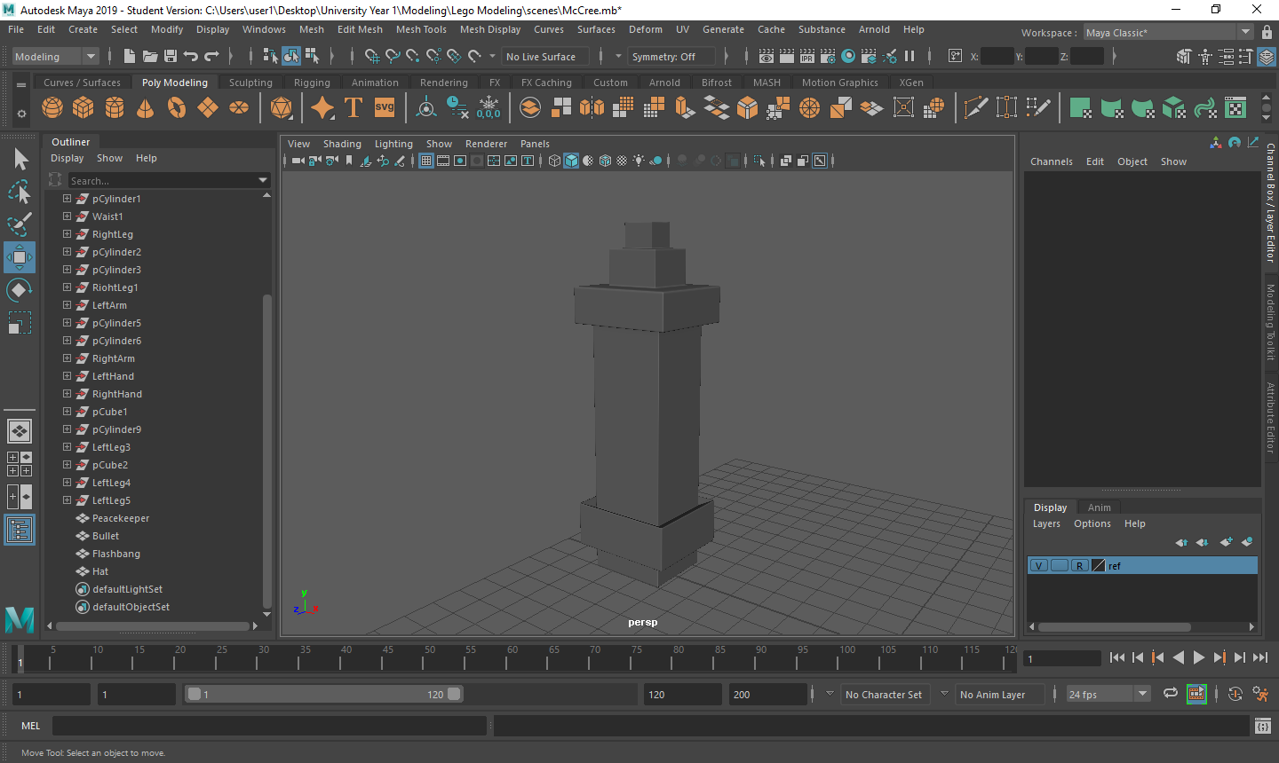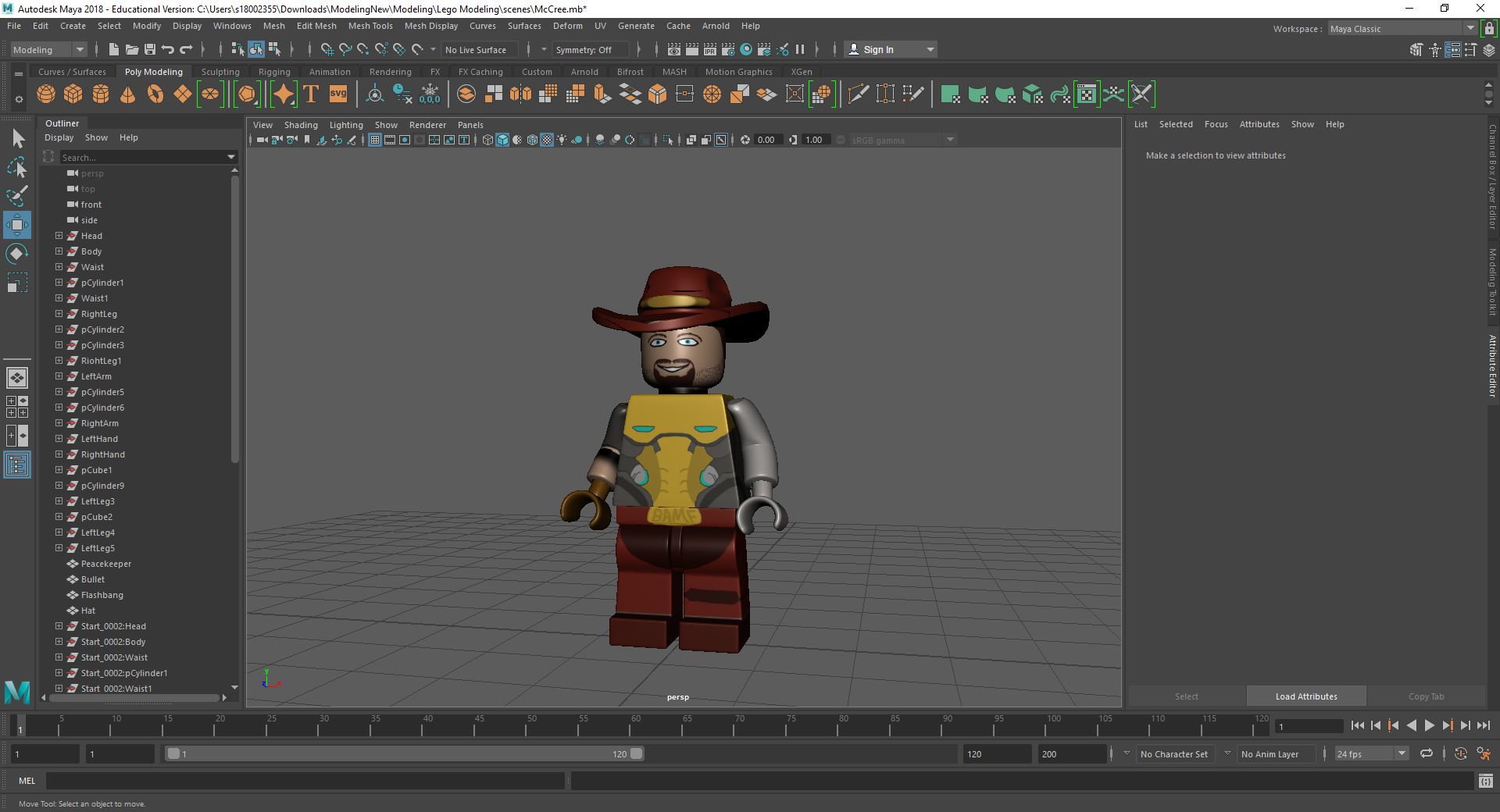 Rigging the LEGO model was a challenge for me. Firstly, with the amount of individual parts I had, making sure that all of the mapping weights were correct took a long time as sometimes there would be one vertex being affected by something it shouldn’t be and that would throw the model out of shape. Secondly, there was many iterations that I went through to make sure that it was perfect for the character I was using. Having parts that had holes in them or were attached to a certain joint also took a couple tries to figure out what I was doing.