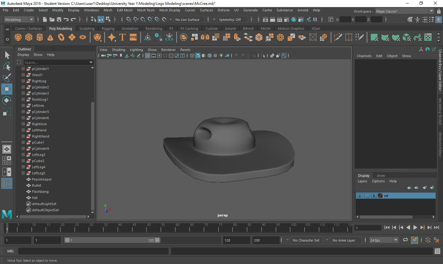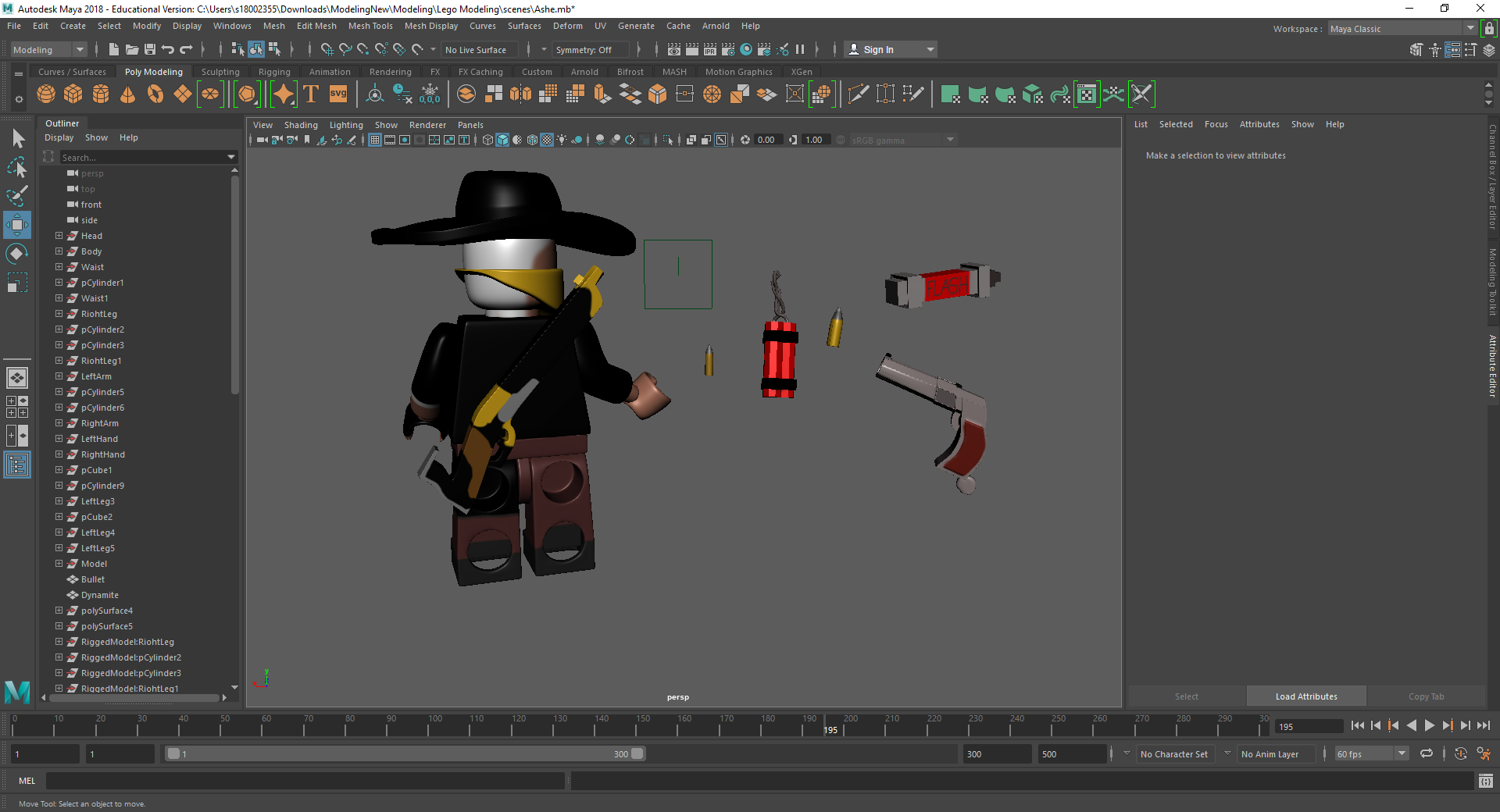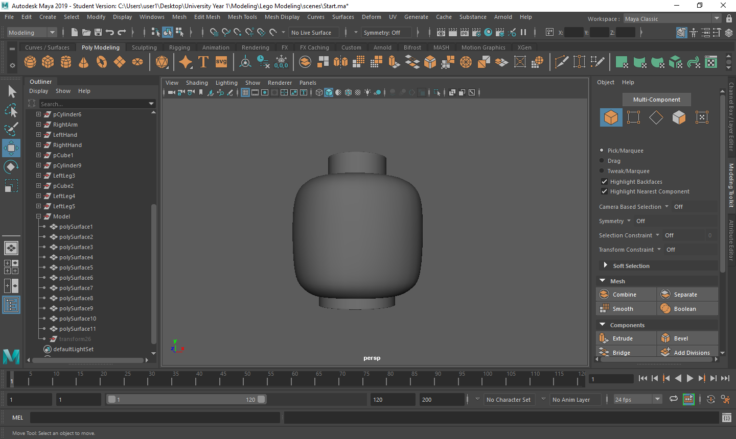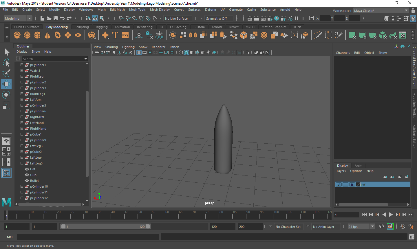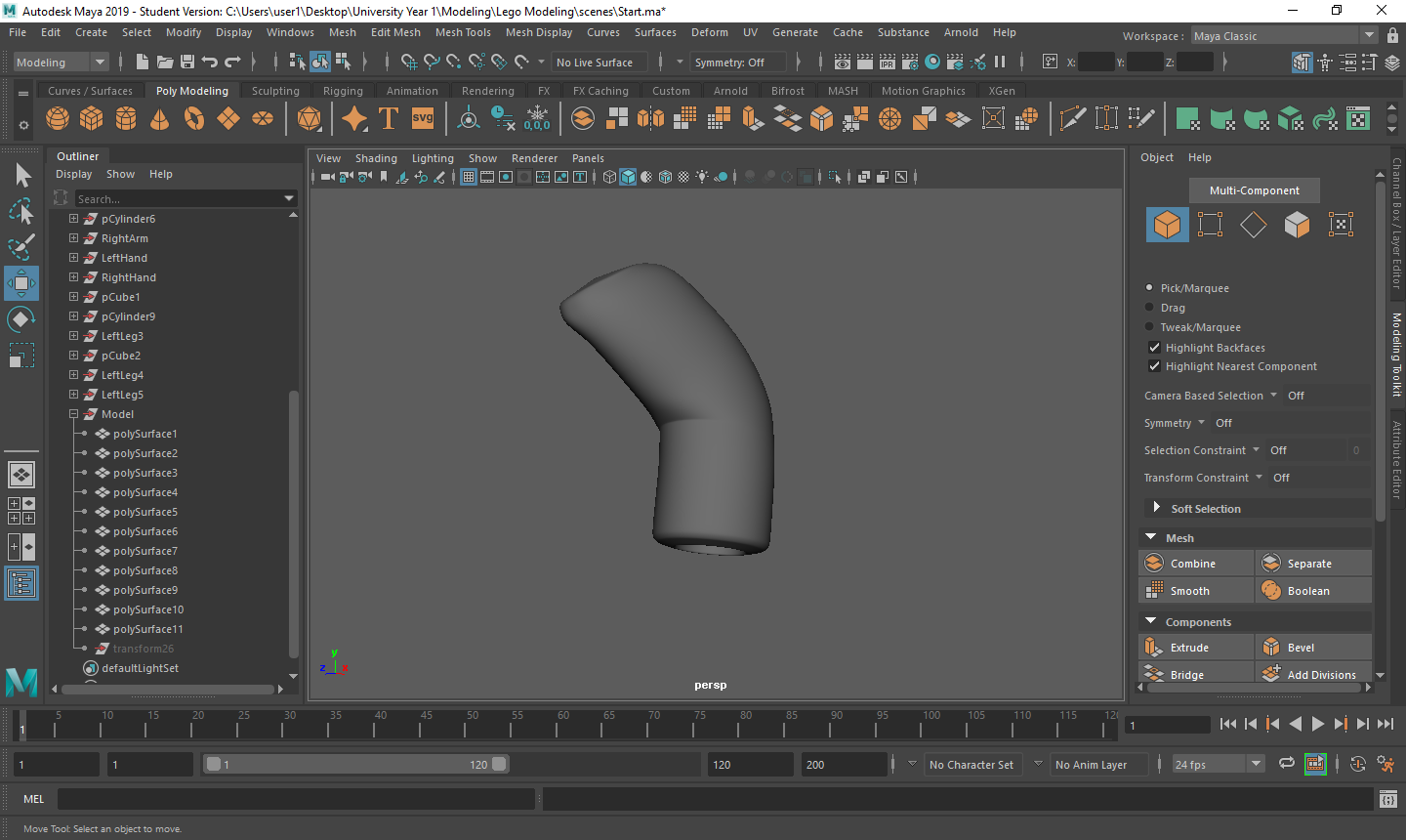 Rigging the LEGO model was a challenge for me. Firstly, with the amount of individual parts I had, making sure that all of the mapping weights were correct took a long time as sometimes there would be one vertex being affected by something it shouldn’t be and that would throw the model out of shape. Secondly, there was many iterations that I went through to make sure that it was perfect for the character I was using. Having parts that had holes in them or were attached to a certain joint also took a couple tries to figure out what I was doing.