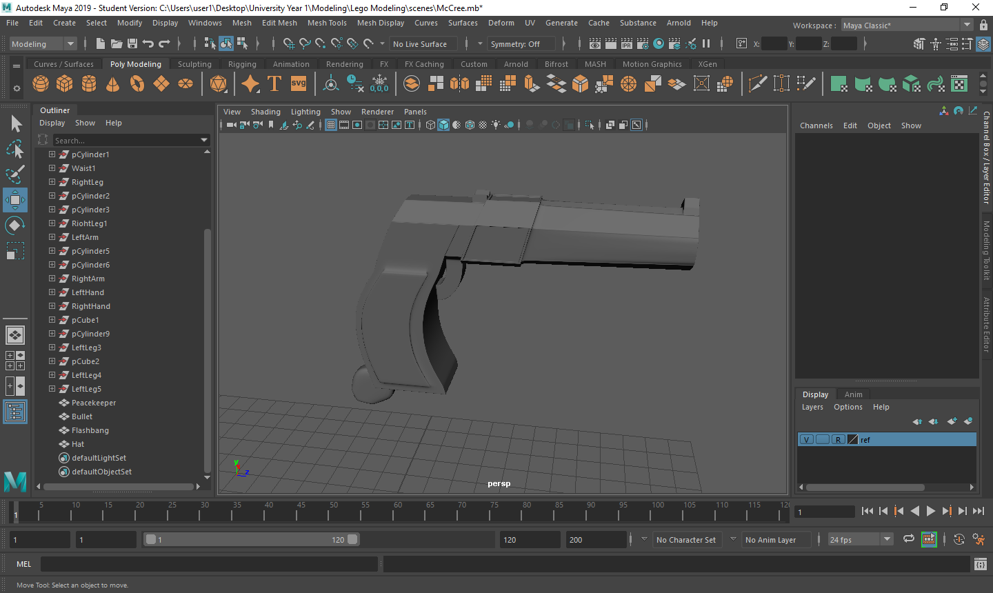 Creating the custom pieces for my scene was a very good exercise for me. When creating the model I was working with 2 images that I could scale from and when completed, I knew it would look like a realistic LEGO model. That particular way of building was very useful to me starting Maya as I knew when I was getting the objects right and allowed me to experiment with a few techniques to see if they would work. Going onto the custom pieces, not having that “crutch” of the images was a challenge at the beginning but it also allowed me to express some freedom in the way I working. With the model scaled perfectly, I knew that I could scale the custom pieces to the model and they wouldn’t look out of proportion. Using all of the techniques that I learned from creating my model I knew I could come up with some very good pieces. The guns were the hardest the create as they are intricate objects that have a lot of detail. To combat this, I decided to dumb it down into it simplest form to make sure I had a lot of pieces I could use to build my scene. These are all of the custom items I created for both characters and the environment.